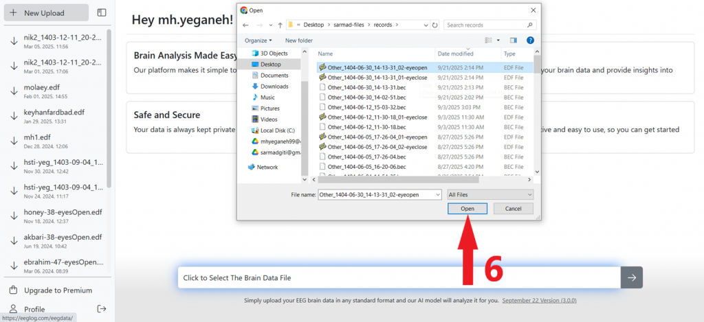 6- بعد از انتخاب فایل نقشه مغزی مورد نظر به فرمت edf، روی دکمه بالا کلیک کنید