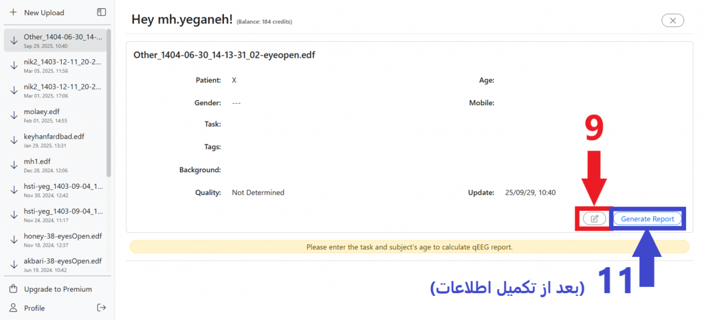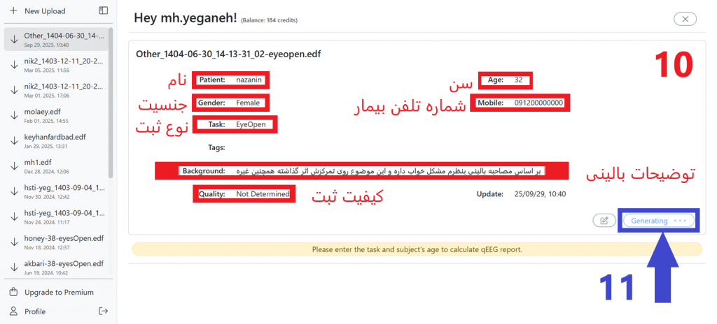 10- پر کردن قسمتهای نام، جنسیت، نوع تست(چشم باز یا بسته) و سن اجباری میباشد و در صورت ناقص بودن این نواحی، گزارش تولید نمیشود