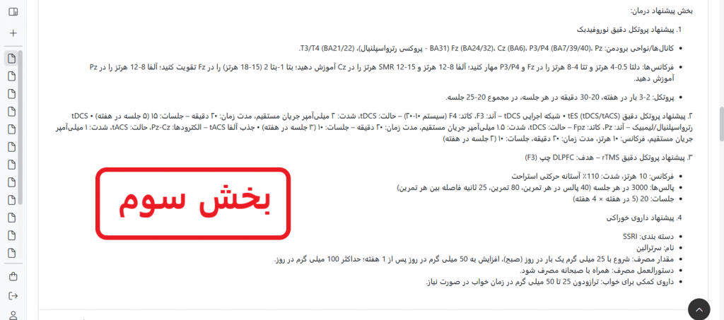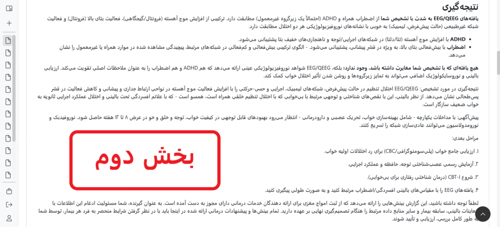 نکته 3: با وارد کردن شماره تلفن بیمار در قسمت مشخص شده، پس از پایان پروسه تحلیل، گزارش خام و بدون تحلیل هوش مصنوعی برای بیمار پیامک میشود و نیازی به پرینت خروجی نوروگاید و تحویل به بیمار وجود ندارد، نمونه پیامک ارسال شده برای بیمار به شرح زیر است:
