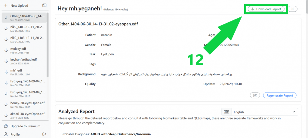 12- شما میتوانید با کلیک بر روی آیکون سبز رنگ، گزارش را به فرمت pdf دانلود کرده، پرینت کنید و در پرونده بیمار نگهدارید، البته گزارشات همیشه در اکانت شما ذخیره شده و قابل دانلود خواهد بود
